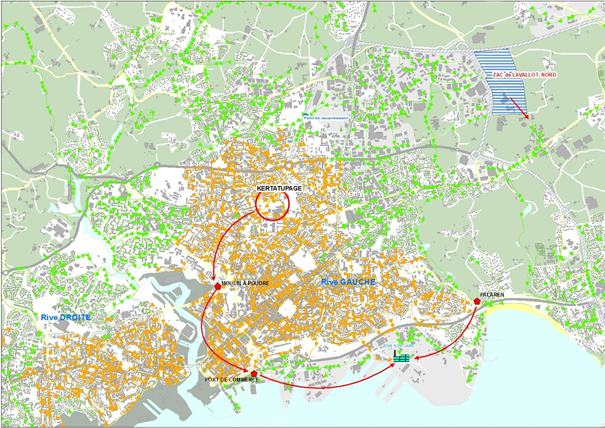 Le projet à Kertatupage est un exemple de bassin de stockage pour la gestion des unitaires. L’ouvrage dont la construction a démarré fin juillet et qui devrait s’achever fin août est constitué d’un bassin aérien (18 440 M3) pour prévenir des inondations (à Kerinou notamment) et de deux bassins enterrés (10 000 M3 et 2 000 M3) pour la gestion des unitaires (cf. figure ci-dessous).